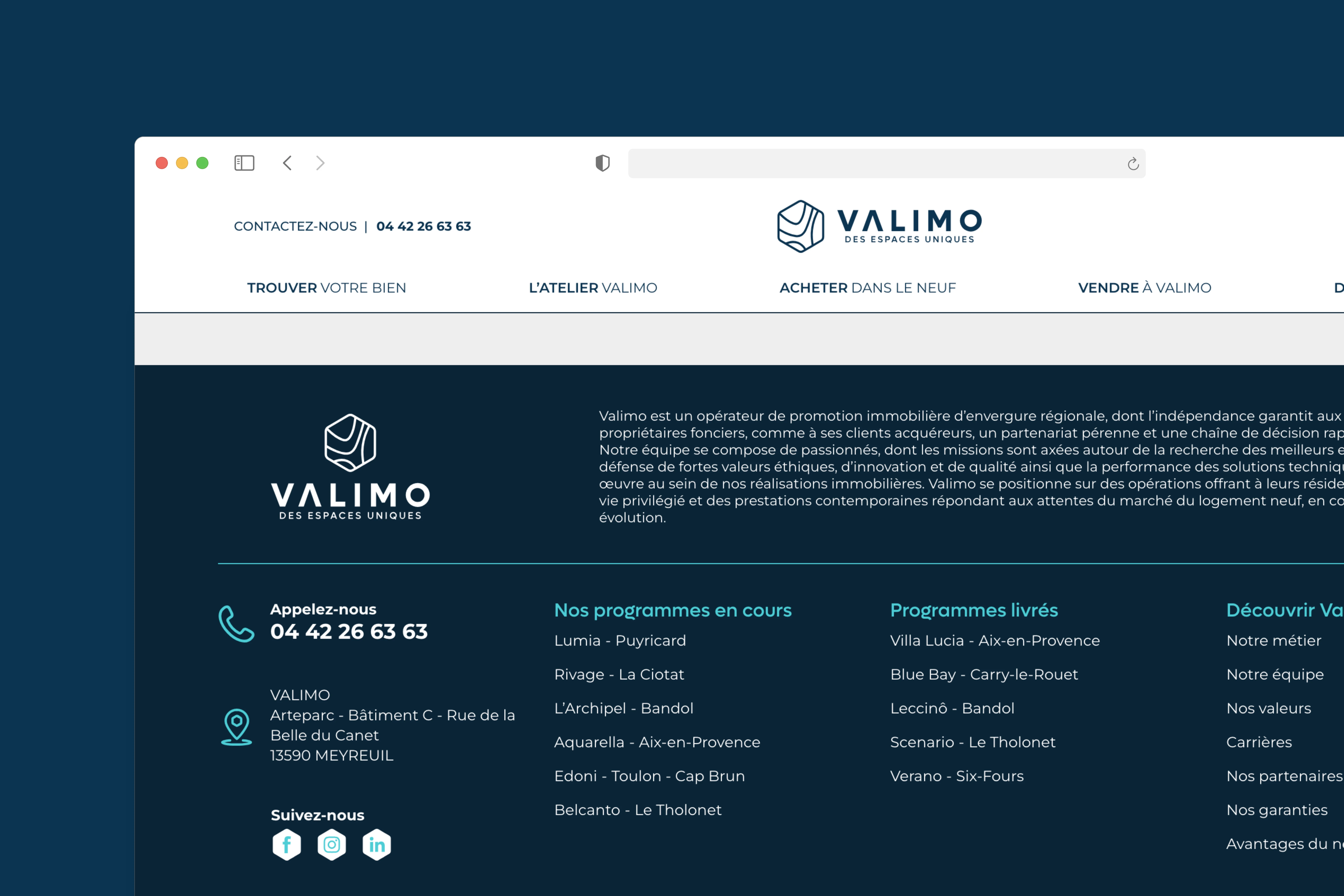 Valimo est un opérateur de promotion immobilière d’envergure régionale, dont l’indépendance garantit aux collectivités, aux propriétaires fonciers, comme à ses clients acquéreurs, un partenariat pérenne et une chaîne de décision rapide et efficace. Valimo se positionne sur des opérations offrant à leurs résidents un cadre de vie privilégié et des prestations contemporaines répondant aux attentes du marché du logement neuf, en constante évolution.